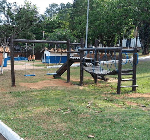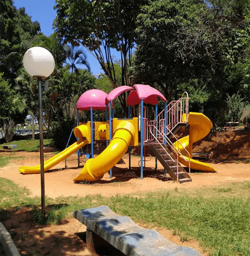 Os playgrounds contam com brinquedos modernos, seguros e distribuídos em áreas sombreadas, proporcionando diversão para crianças com conforto e segurança.
